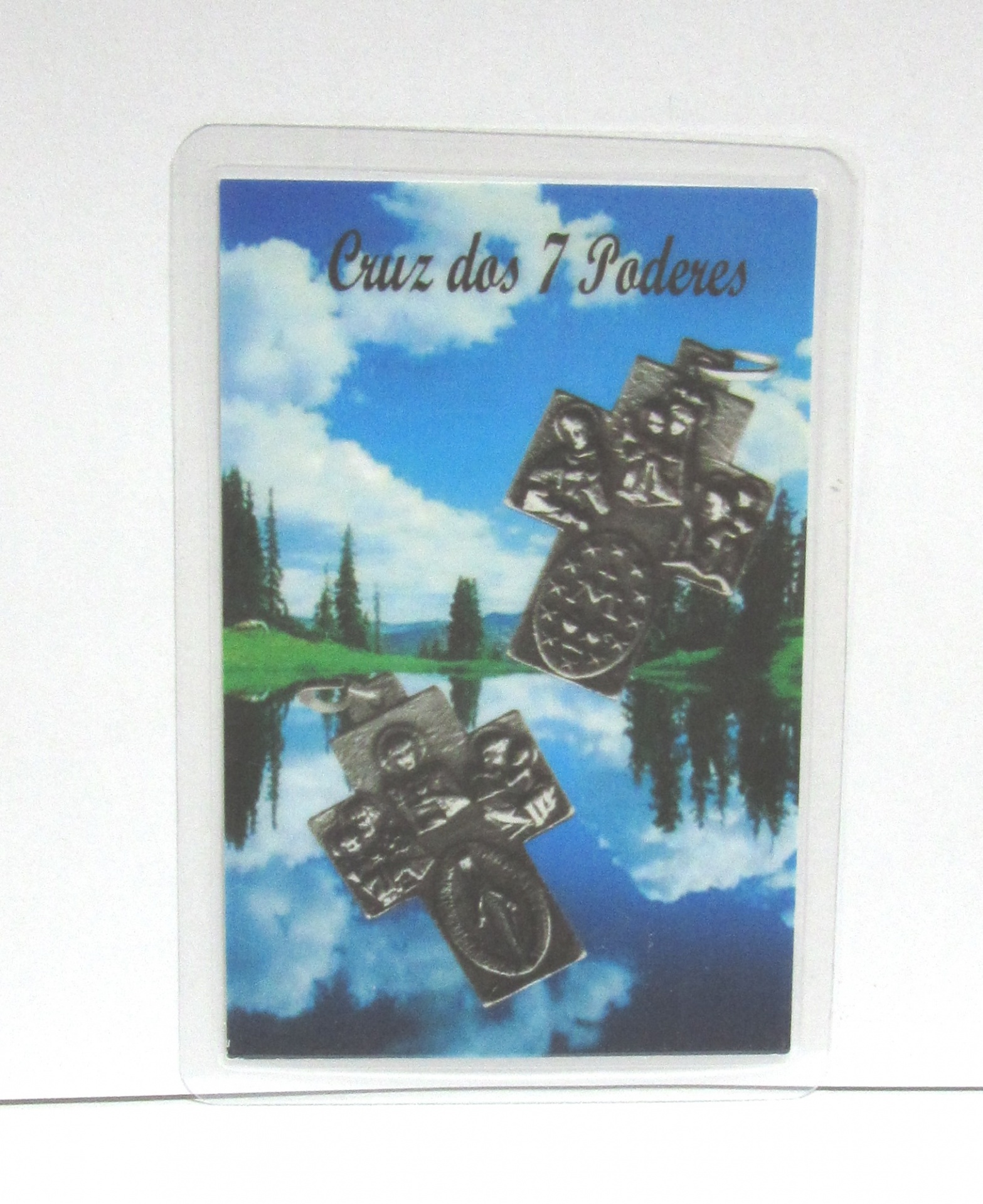 Cartão com duas cruzes decorativas sobre lago e céu azul com texto Cruz dos 7 Poderes