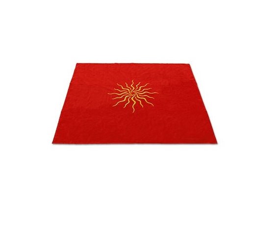O pano para tarot – sol de cor avermelhada da conceituada fábrica de cartas Lo Scarabeo é feito em veludo grosso com o símbolo do sol bordado em dourado.