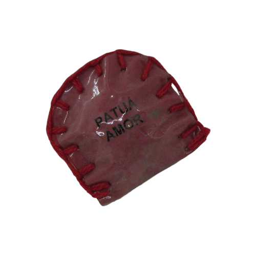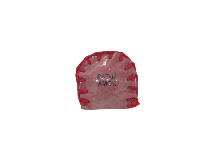 Figura vermelha translúcida semicircular com costura e texto 'PATUA AMOR'