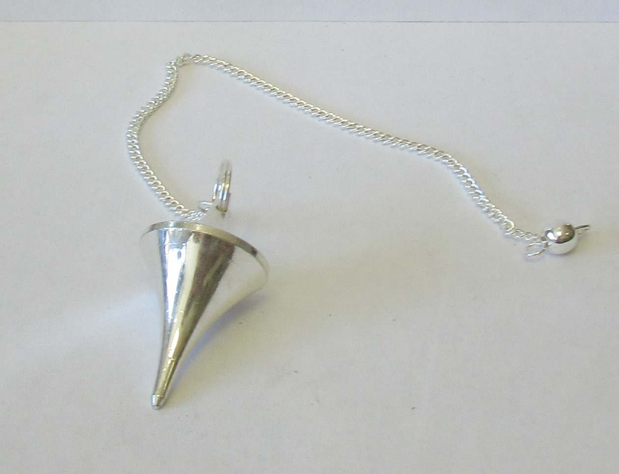 Pêndulo de metal prateado cónico com corrente fina e esfera na extremidade
