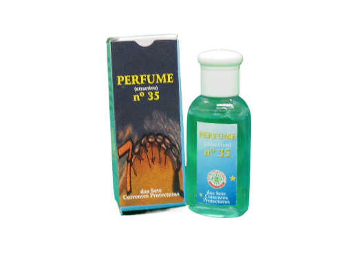 Frasco de perfume verde com embalagem de papelão e texto PERFUME elaborado nº 35