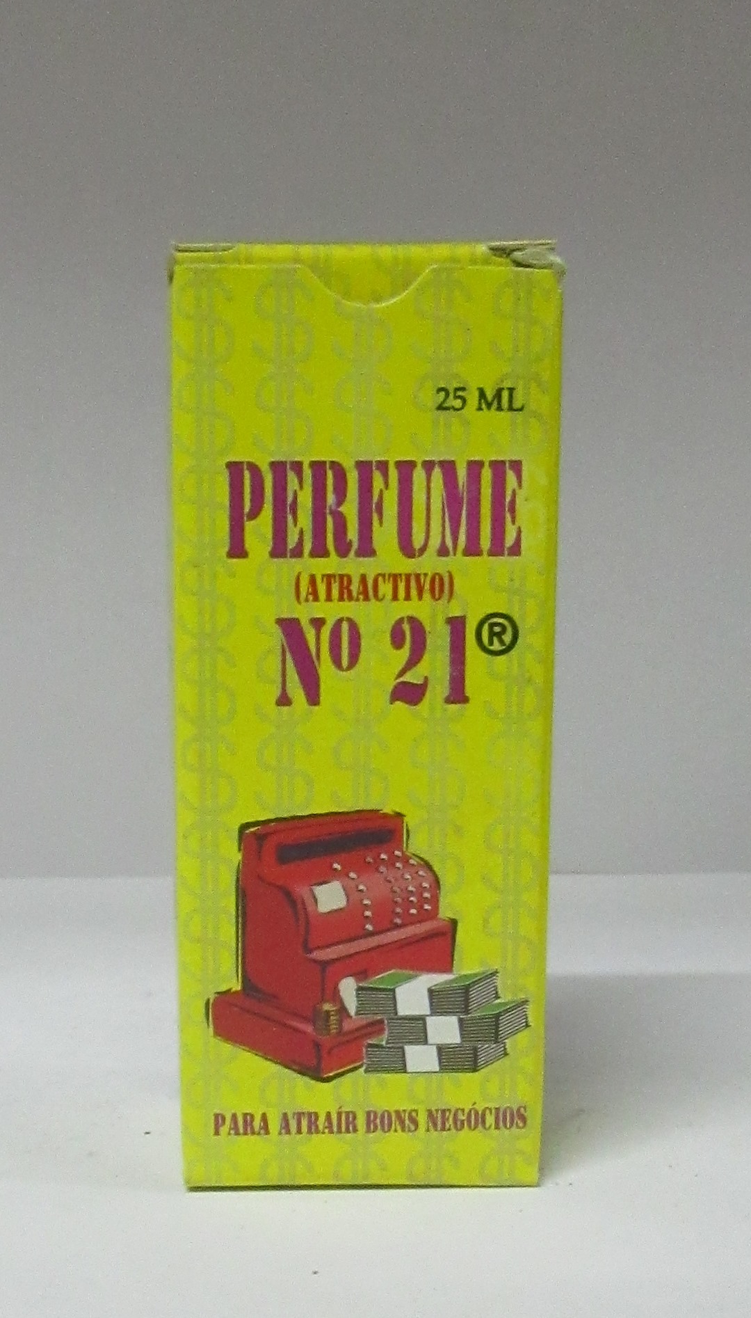 Frasco de perfume Nº 21 com embalagem amarela e verde
