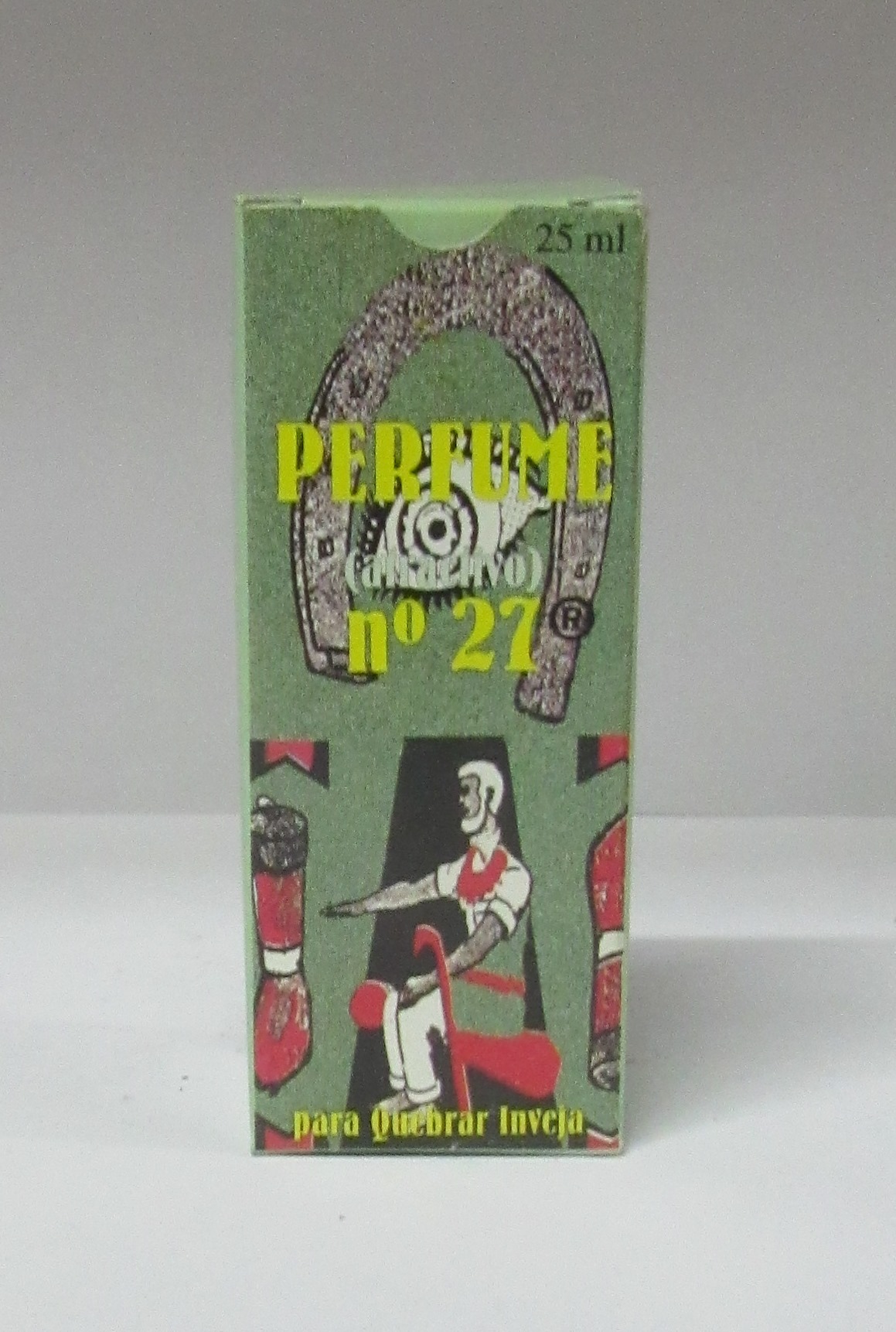 Caixa verde de perfume nº 27 com ferradura e figura masculina sentada