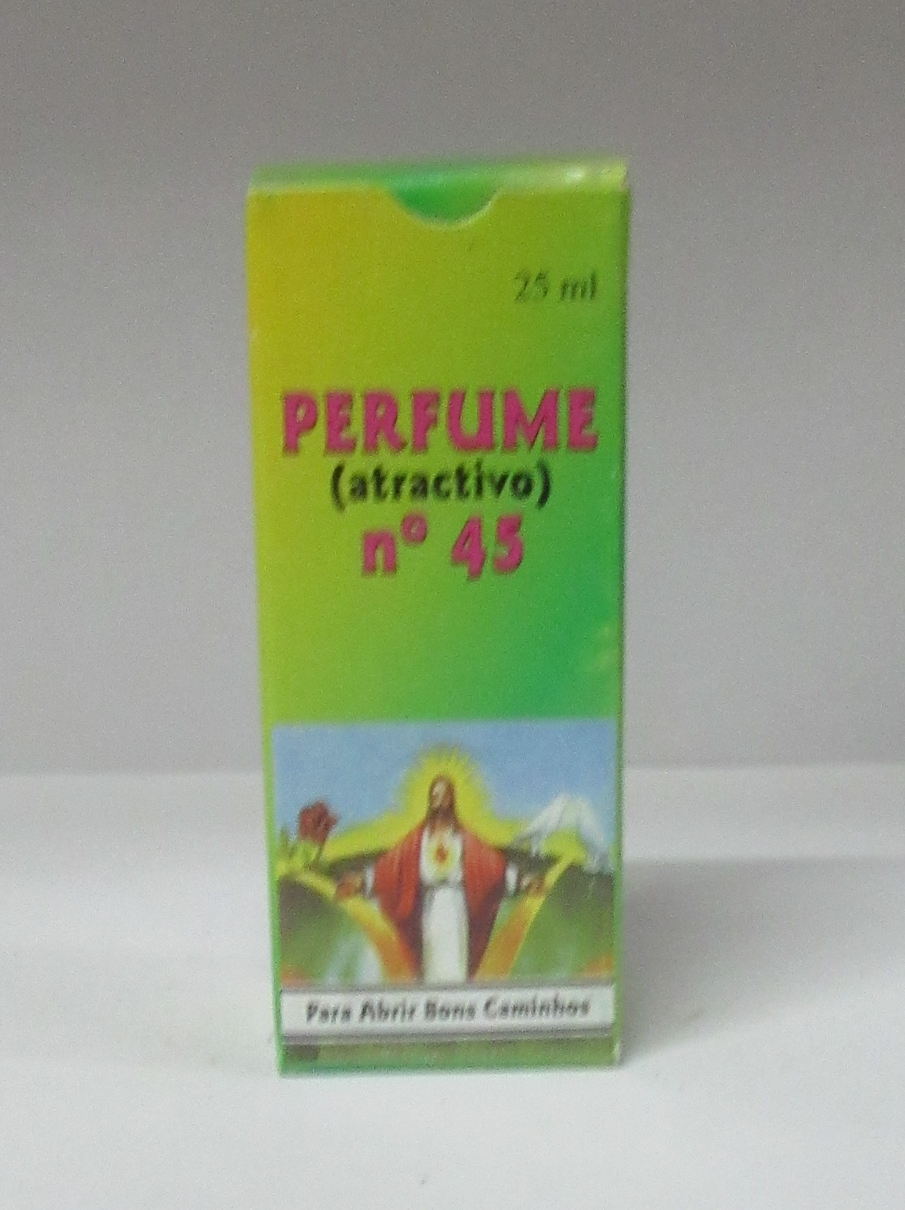 Embalagem verde e amarela de perfume n.º 45 com figura religiosa e texto em português.