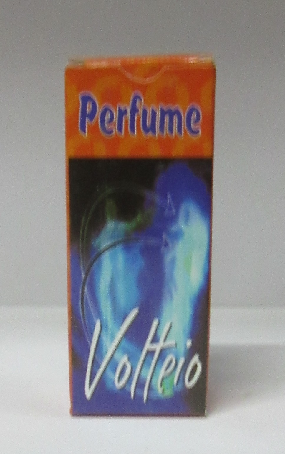 Embalagem de perfume Volteio laranja e azul com texto Perfume