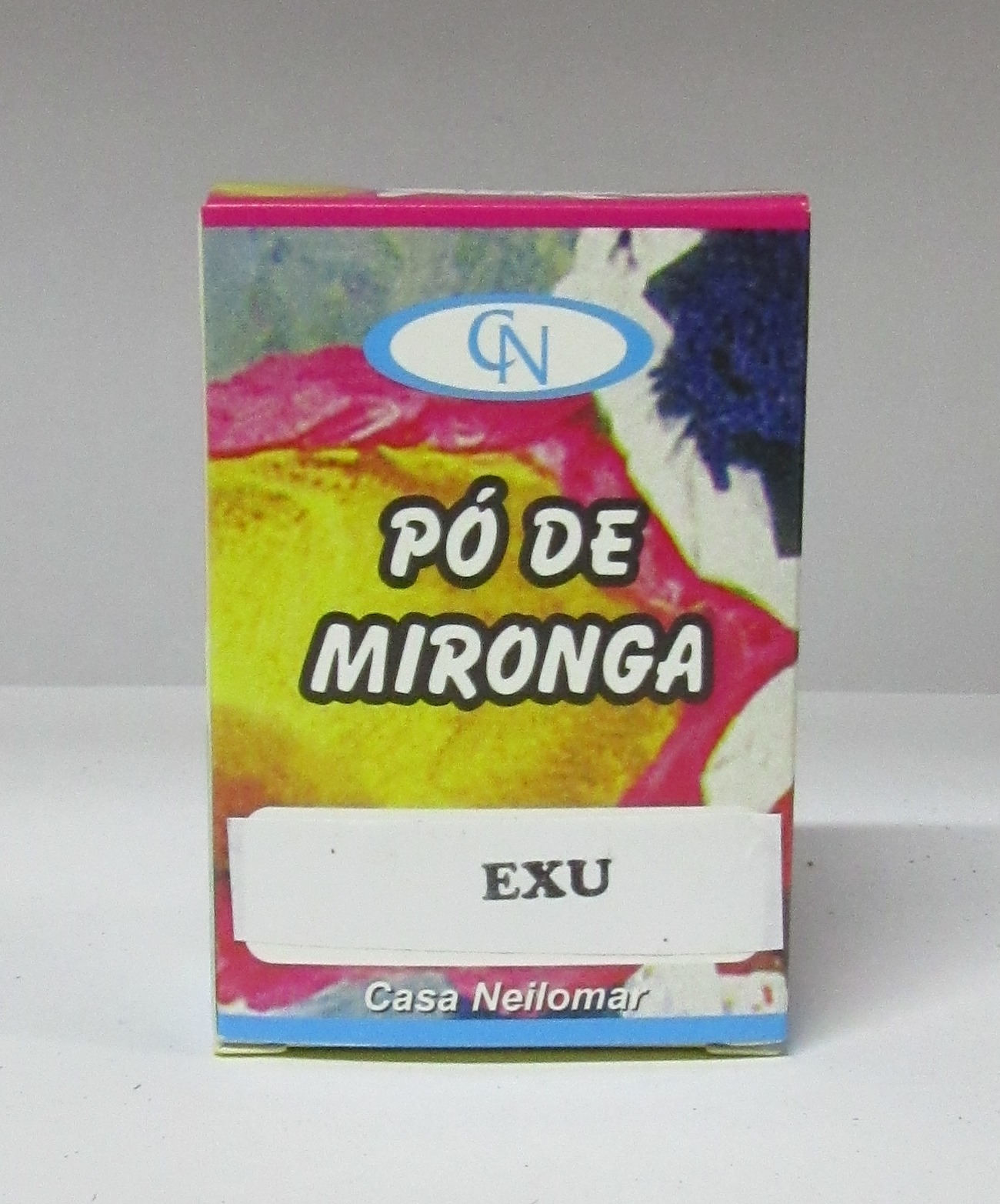 Caixa colorida de pó de mironga com texto e imagem abstrata