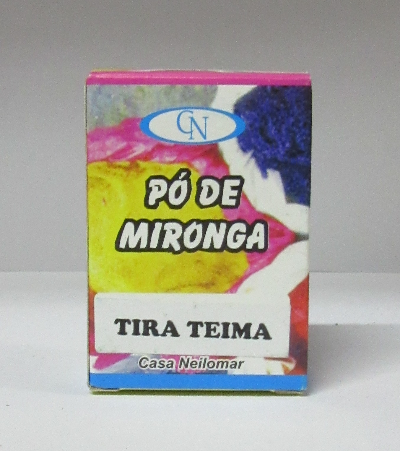 Embalagem colorida de Pó de Mironga com textos e fundo neutro