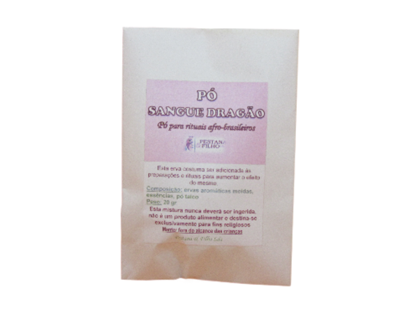 Pacote de papel com etiqueta Pó Sangue Dragão para rituais afro-brasileiros