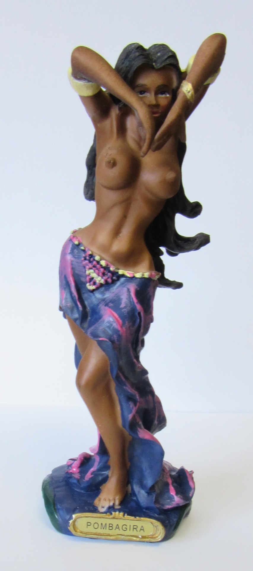 Estátua decorativa de mulher com saia azul e rosa e placa POMBAGIRA