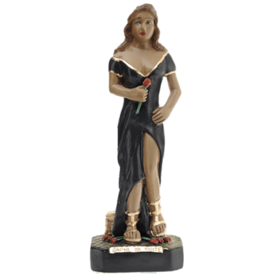 Estátua decorativa mulher com vestido preto e rosa vermelha