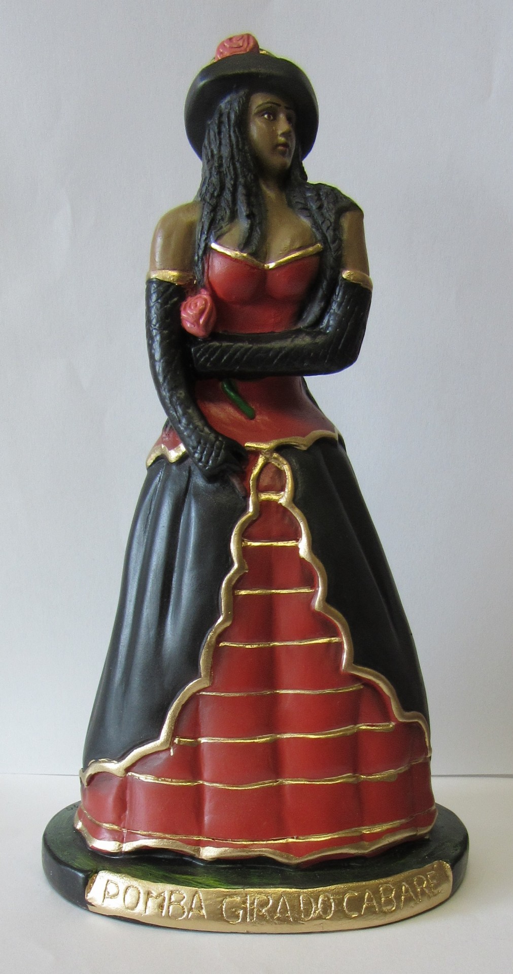 Estátua de figura feminina em vestido vermelho e preto com base escrita POMBA GIRA DO CABARÉ