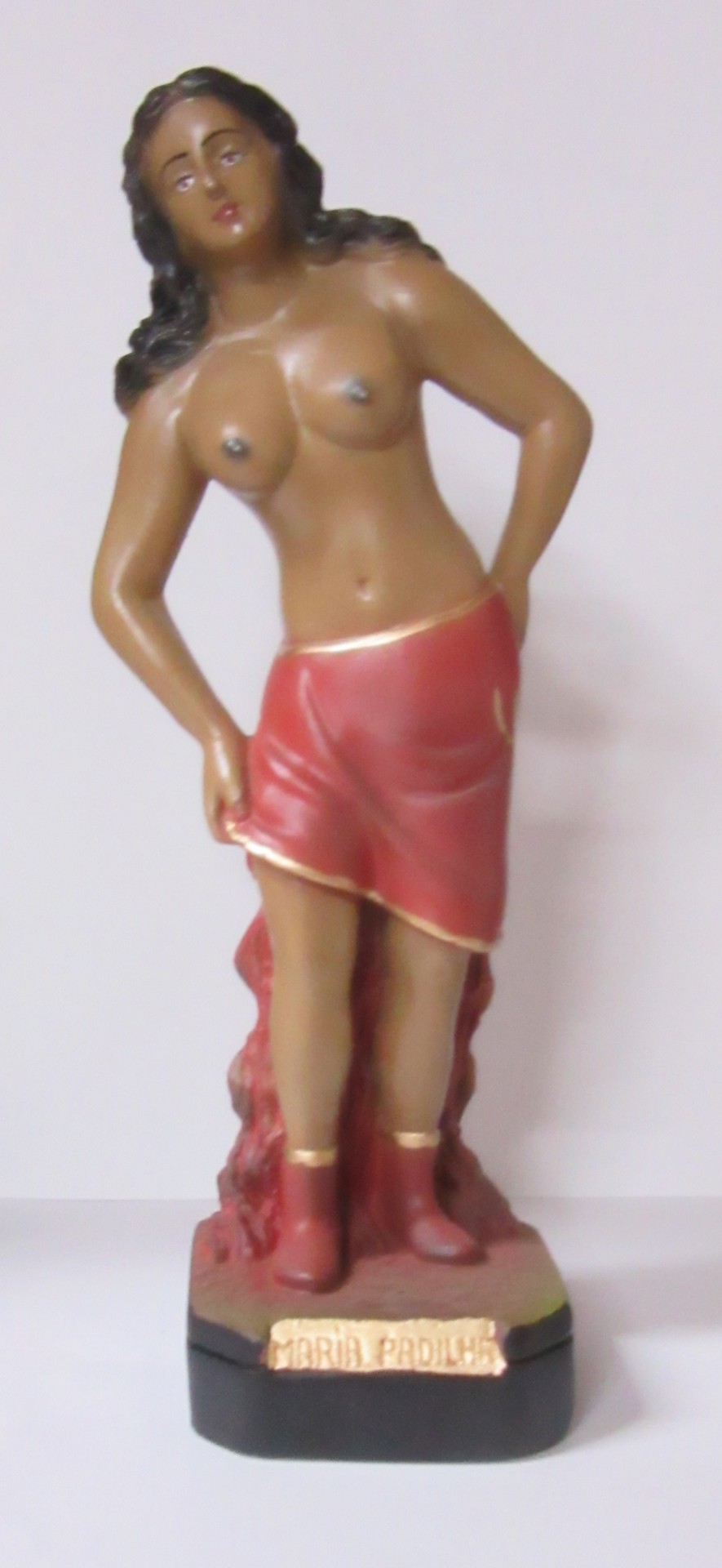 Estátua de mulher topless com saia vermelha e base preta com placa dourada