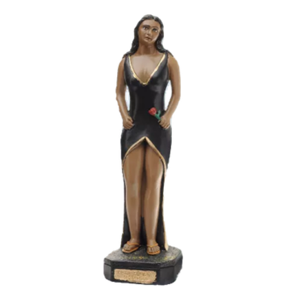 Estátua de mulher em vestido preto segurando uma rosa