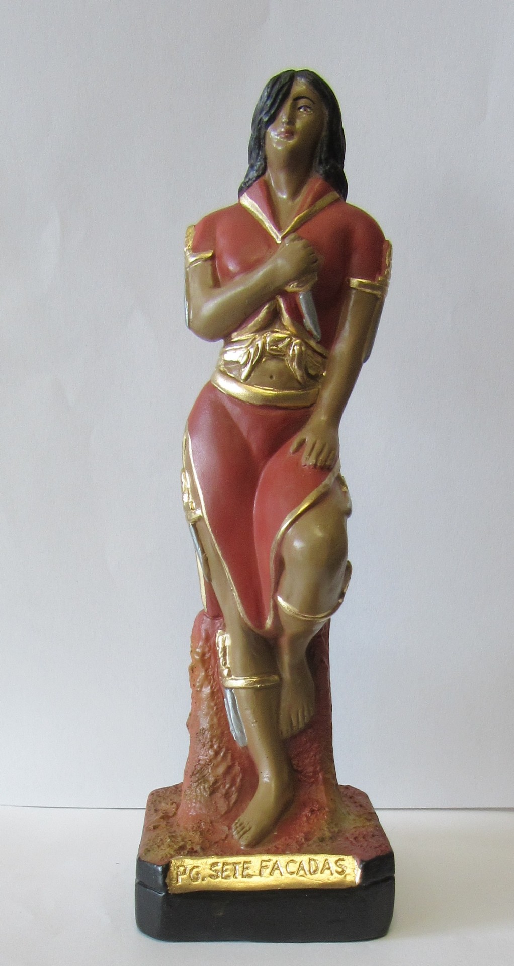 Estátua de mulher em resina com base preta e inscrição PG. SETE FACADAS