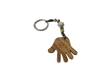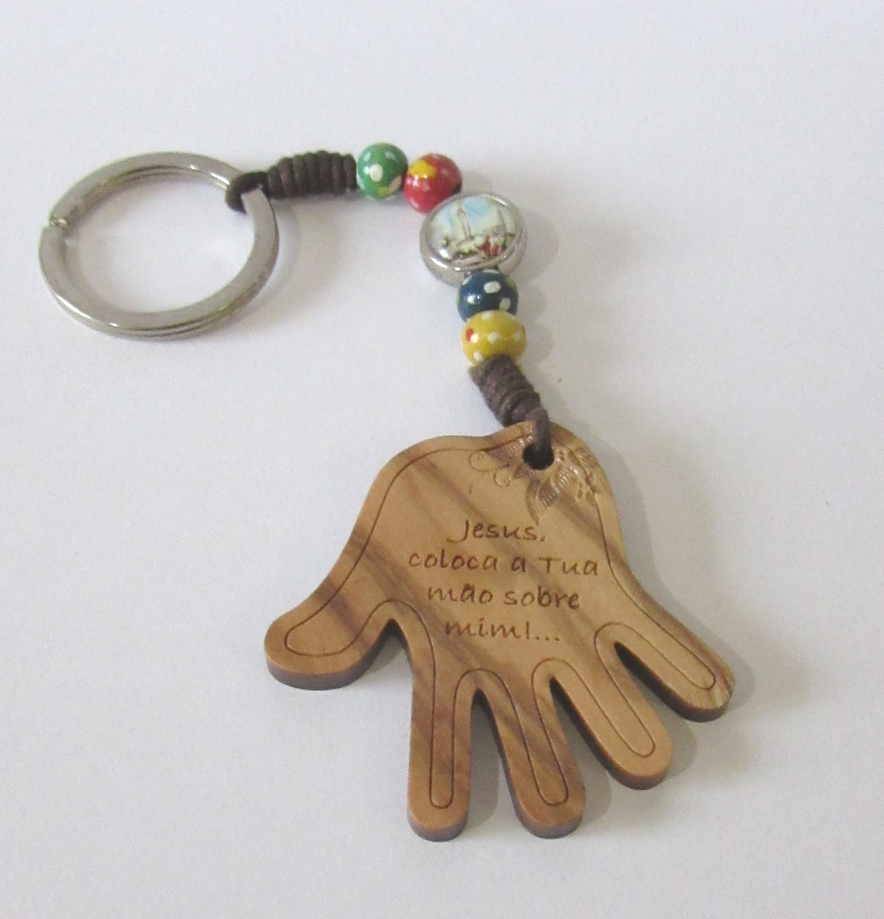 Porta-chaves de madeira em forma de mão com contas coloridas e corrente metálica.