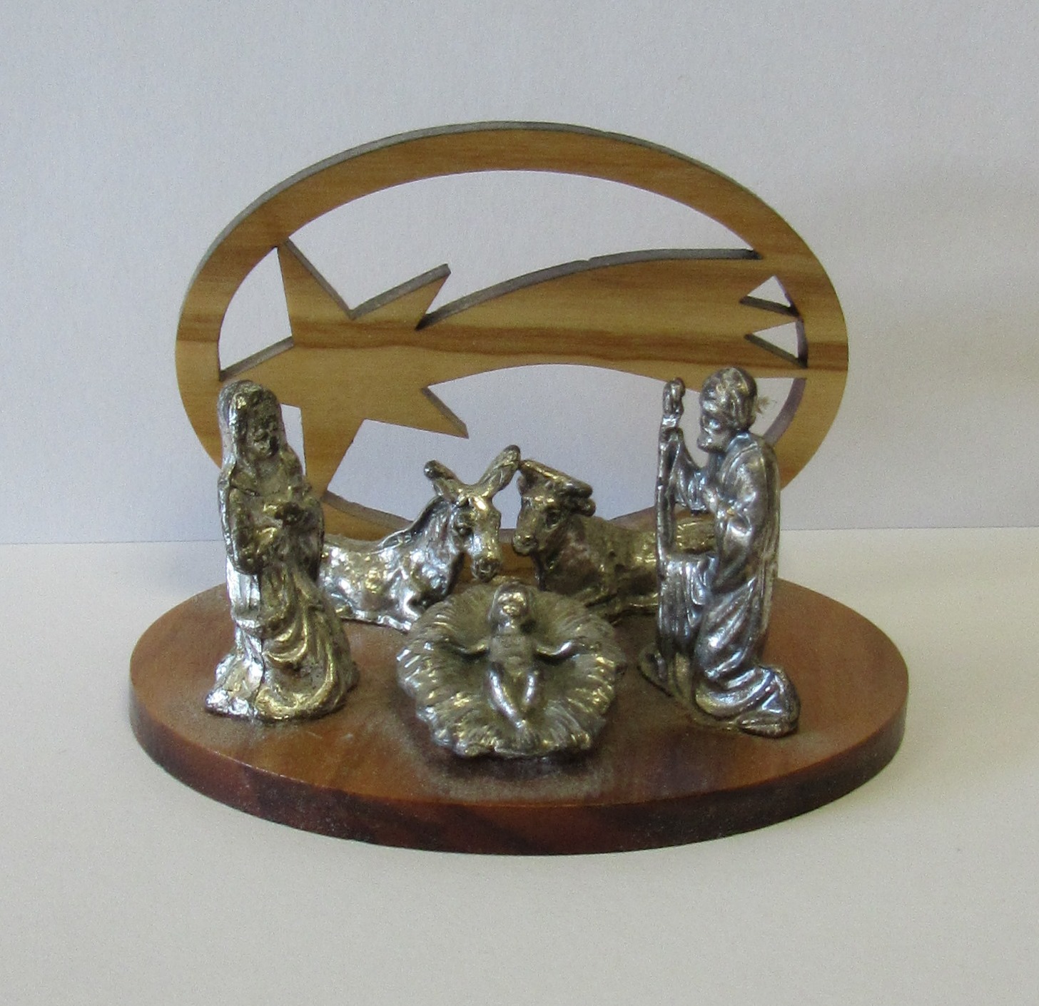 Presépio pequeno com figuras metálicas e base de madeira