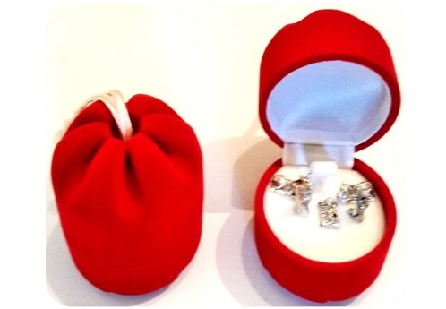 Caixa de veludo vermelha em formato de maçã com joias prateadas dentro