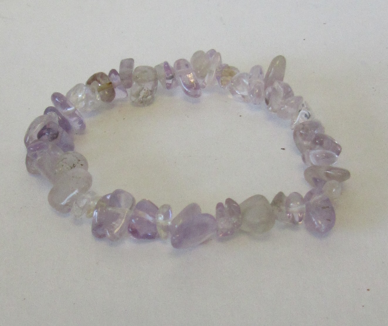 Pulseira de pedras lilás e brancas sobre superfície branca