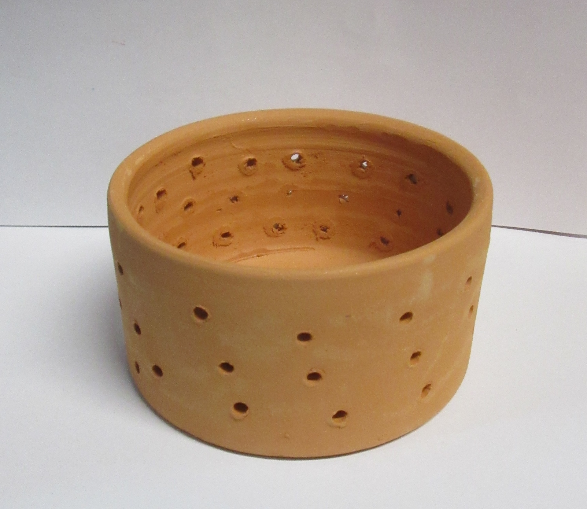 Recipiente de cerâmica castanha com buracos, sobre superfície e fundo brancos