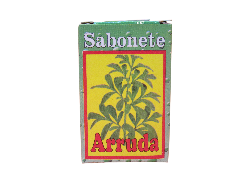 Caixa de sabonete chamada Arruda com imagem de planta e texto em fundo verde e amarelo