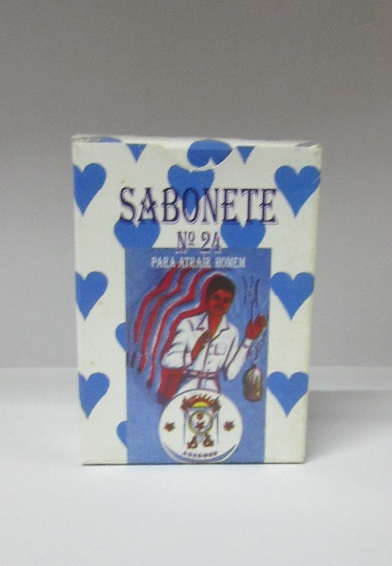 Caixa de sabonete com corações azuis e imagem de homem e bandeira