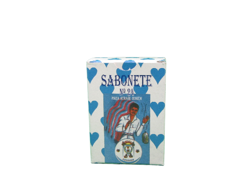 Caixa de sabonete com padrão de corações azuis e etiqueta azul frontal com texto e figura masculina