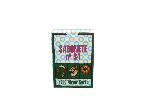 Embalagem de sabonete número 34 com texto e imagens coloridas para atrair sorte