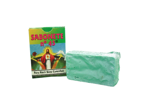 Sabonete n° 45 com embalagem colorida e imagem religiosa