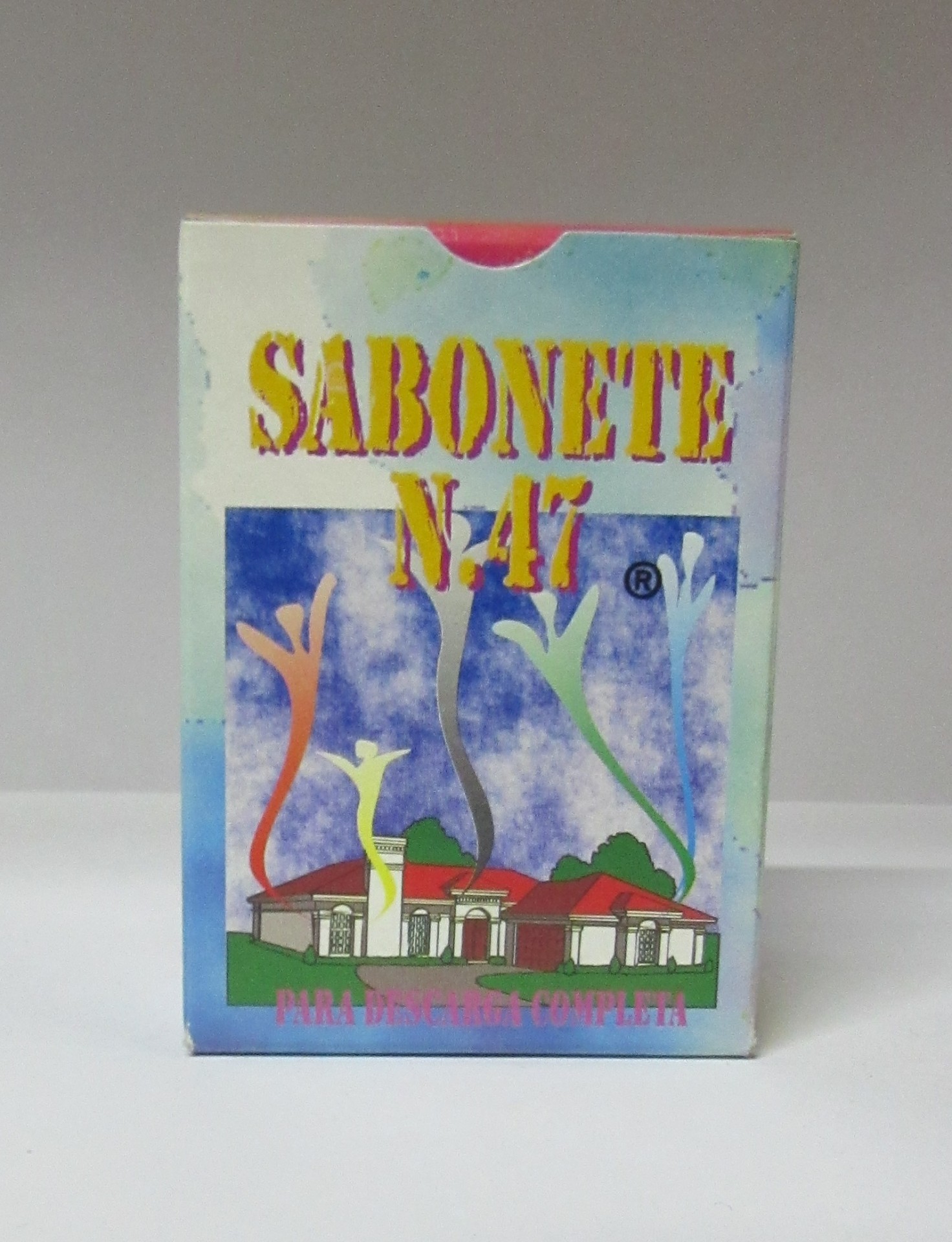 Caixa colorida de sabonete SABONETE N.47 com imagem de casa e texto para pele seca e completa
