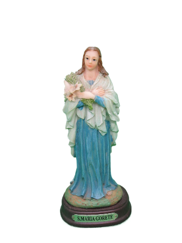 Estátua de S. Maria Goretti com vestido azul e manto branco segurando flores, base castanha com texto