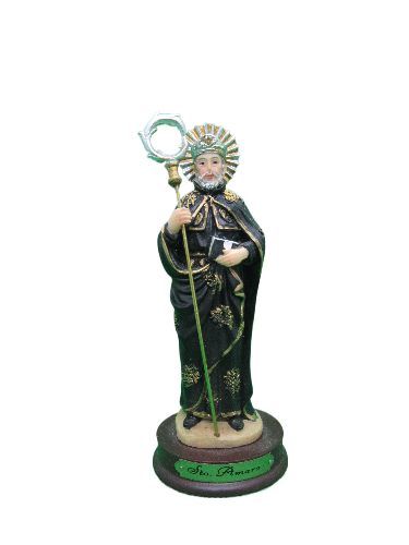 Estátua religiosa de São Amaro com túnica preta e detalhes dourados