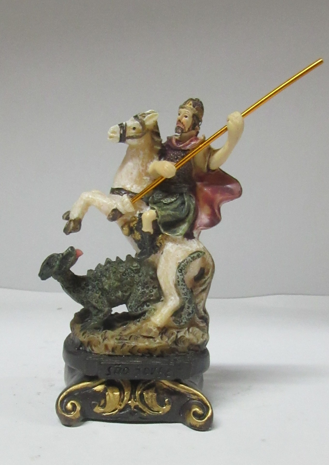 Figurinha de cavaleiro a cavalo com lança a combater um dragão sobre base decorativa