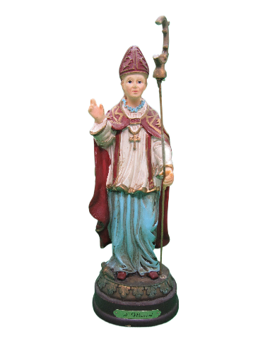 Estátua de São Nicolau com batina, capa vermelha e túnica azul, segurando cajado dourado.