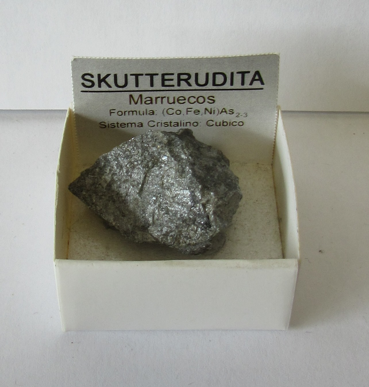 Amostra de mineral metálico cinza em caixa branca com etiqueta informativa