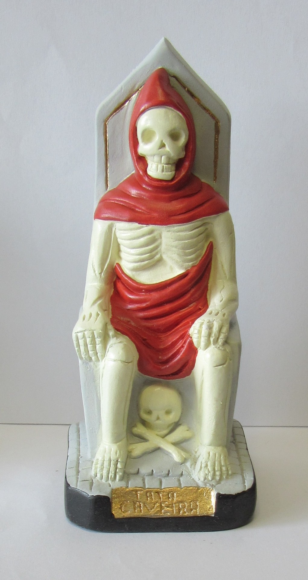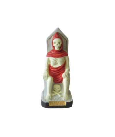 Figurinha de esqueleto vermelho e branco sentado num trono com placa dourada.