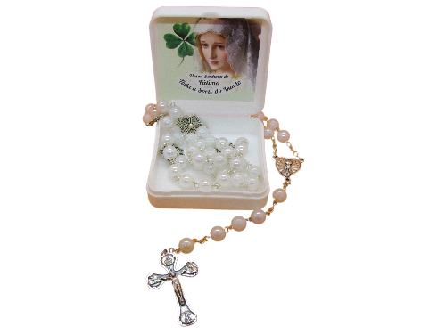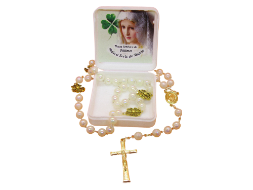 Colar de contas pérola com crucifixo numa caixa branca de veludo