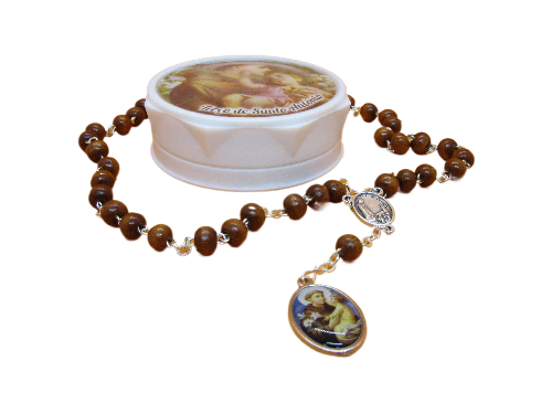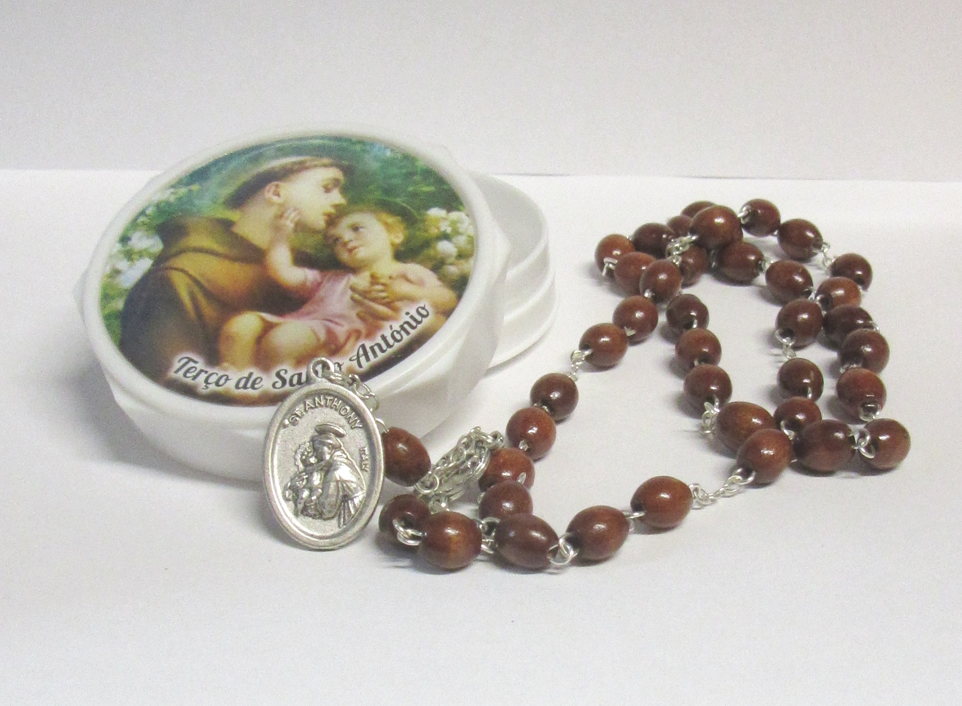 Rosário castanho com medalha e estojo branco com imagem de São António