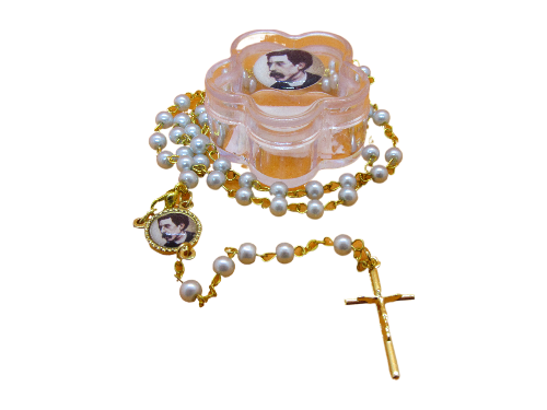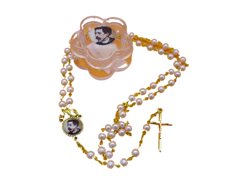 Terço com contas peroladas, crucifixo dourado e caixa plástica com imagem.