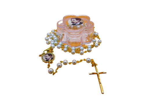 Terço com contas peroladas, corrente dourada, crucifixo e medalha com imagem, sobre caixa plástica em forma de flor