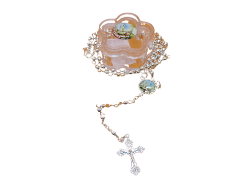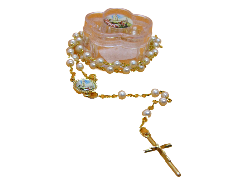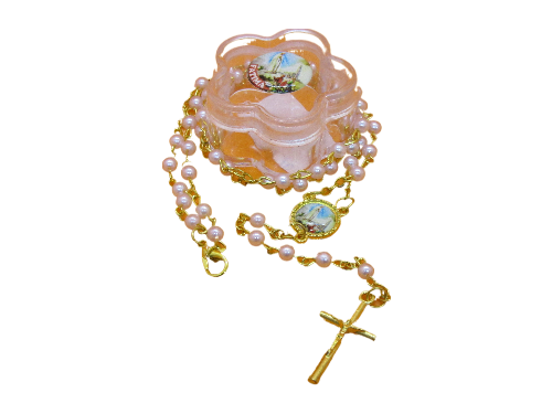 Terço com contas cor de pérola e crucifixo dourado junto a caixa rosa em forma de flor com imagem religiosa