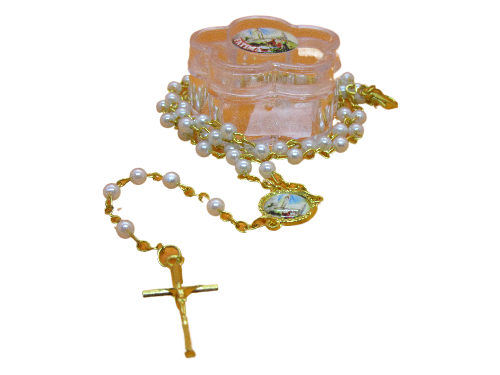 Rosário com crucifixo dourado e caixa de plástico com imagem religiosa