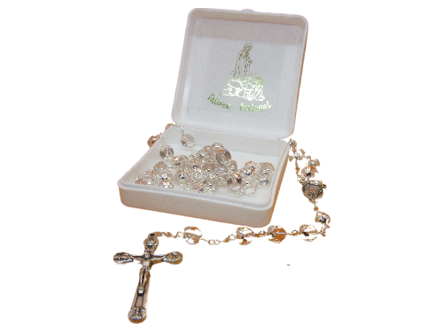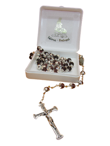 Rosário com contas prateadas em caixa branca com texto Fátima - Portugal