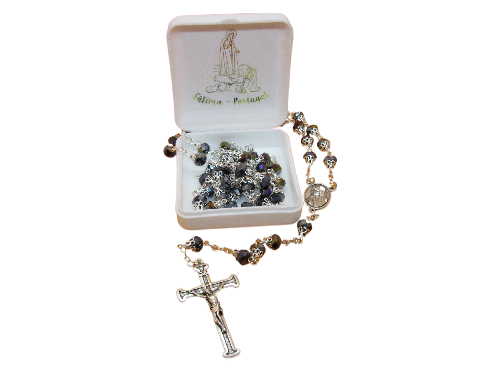 Rosário azul e prateado numa caixa branca com texto 'Fátima - Portugal'