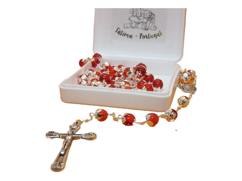 Terço com contas vermelhas e transparentes e cruz prateada na caixa branca com texto 'Fátima - Portugal'