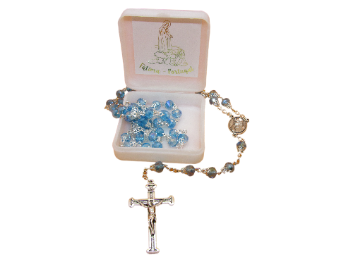 Rosário azul em caixa branca com texto 'Fatima - Portugal'