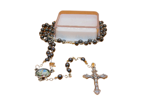 Terço com contas pretas, crucifixo decorado, medalhão colorido e caixa branca
