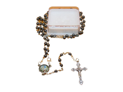 Terço com contas castanhas, medalha colorida e crucifixo prateado sobre caixa transparente