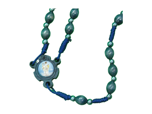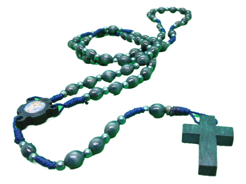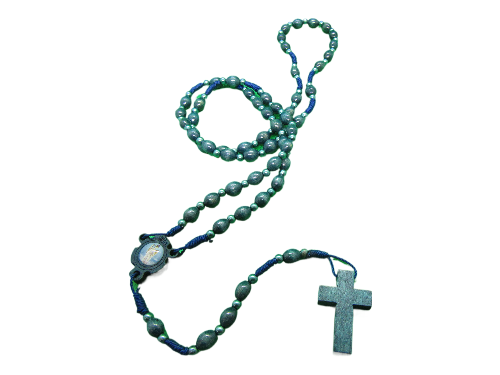 Colar de contas de madeira verdes com cruz e medalha religiosa