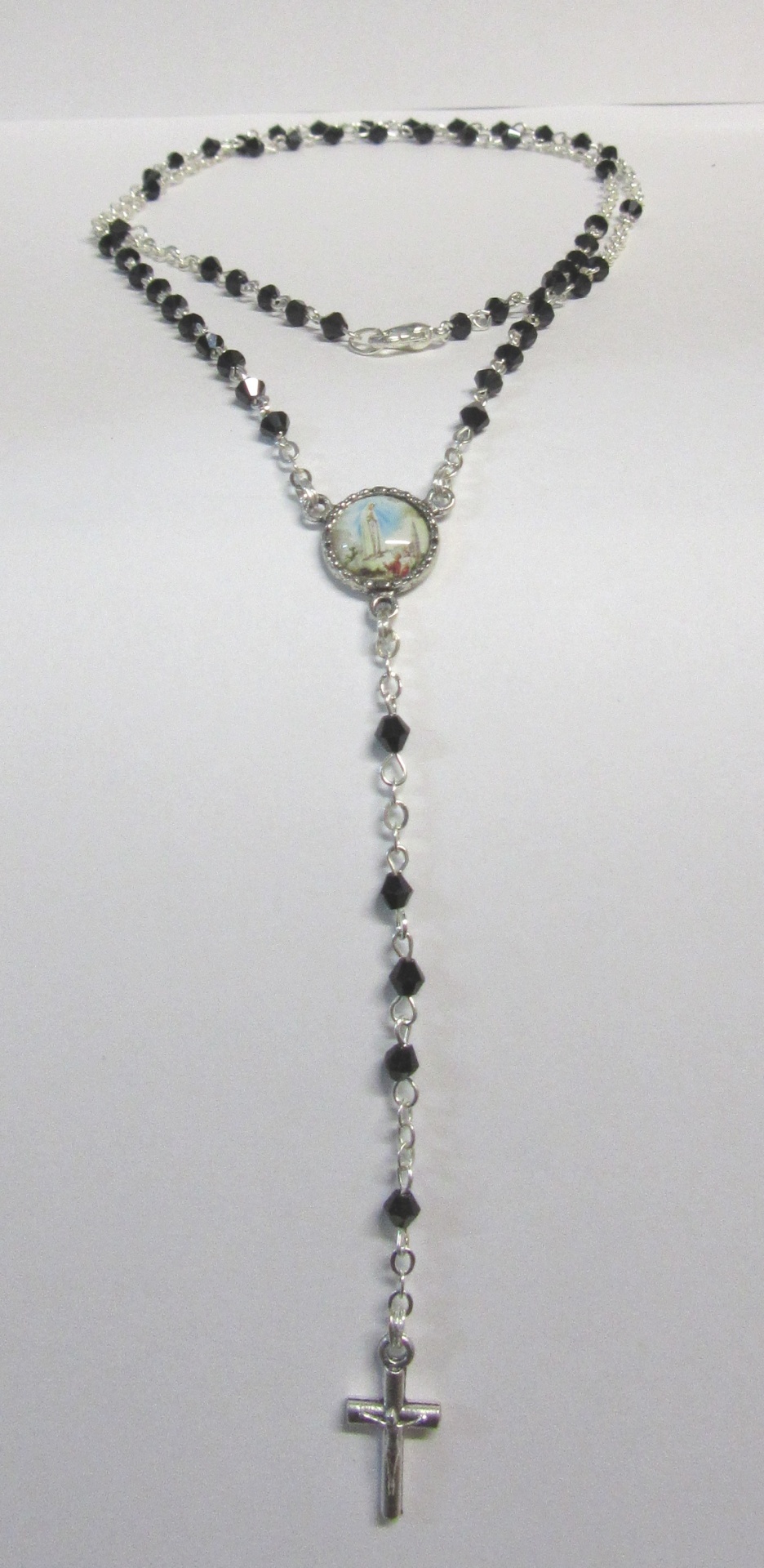 Rosário em contas pretas e prata com crucifixo e imagem central com paisagem