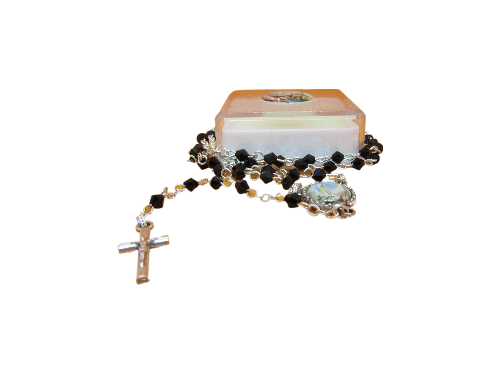 Colar com crucifixo em metal com contas pretas e medalha colorida num estojo branco